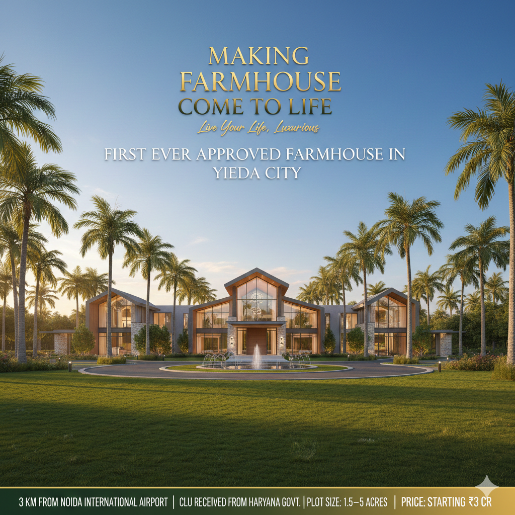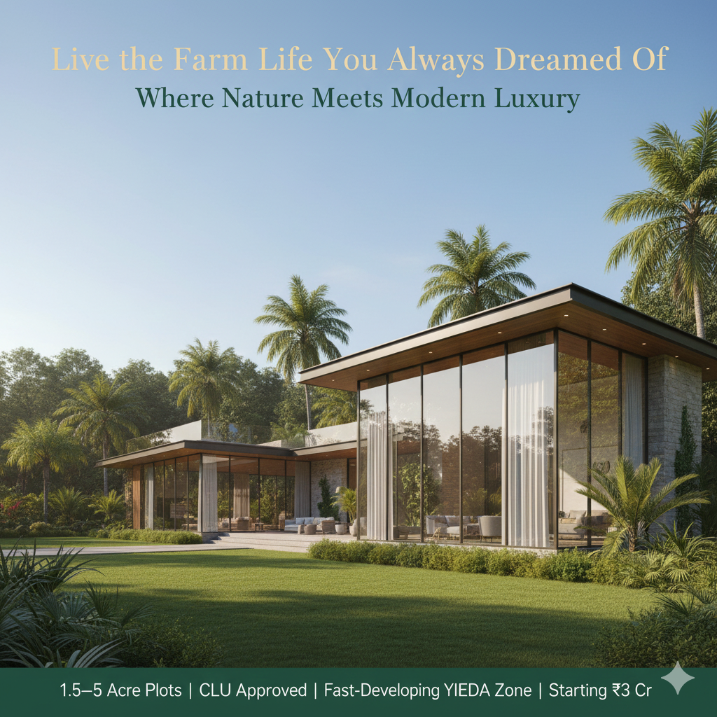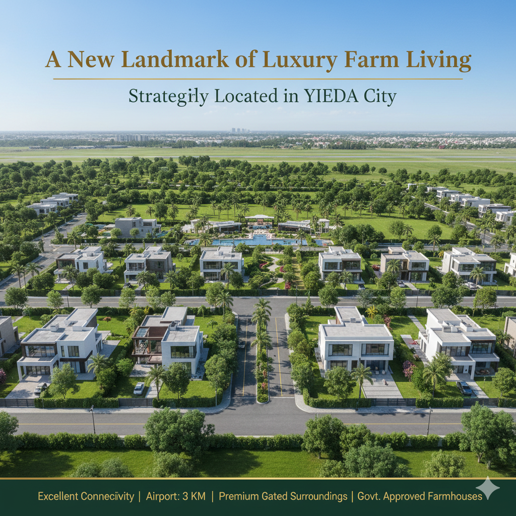 Spread across acres of lush greenery, this iconic development has been thoughtfully planned to give residents the experience of living in a peaceful retreat without losing the essential advantages of city connectivity. Strategically located just a few minutes away from the upcoming Noida International Airport, the project enjoys a location that is not only convenient today but also holds immense future potential. With the airport expected to transform the entire region into a global hub of business, tourism, hospitality, and infrastructure, owning a farmhouse here becomes much more than just a lifestyle upgrade β it becomes a powerful and future-proof investment.