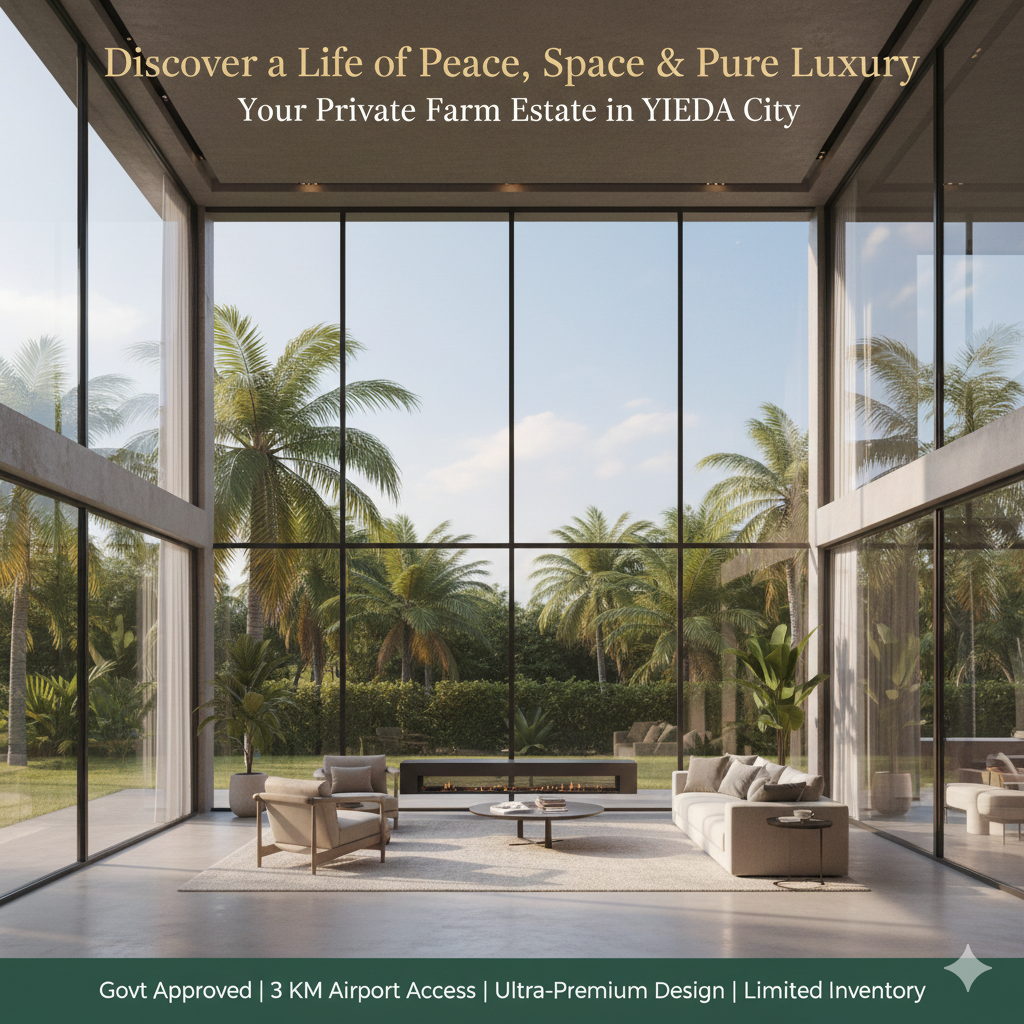 AGF Group brings you an exclusive opportunity to own a luxurious, fully approved farmhouse in the fast-growing and highly promising YIEDA City. Designed for those who dream of an elevated lifestyle surrounded by nature, open spaces, and complete privacy, this project offers a rare and unmatched blend of comfort, convenience, security, and long-term value. As one of the regionβs first and most prestigious approved farmhouse communities, it sets a new benchmark for modern living while staying rooted in natural beauty.